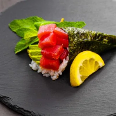 avocat, concombre, ciboule, mangue, wagame, edamame et tartare de thon | ||