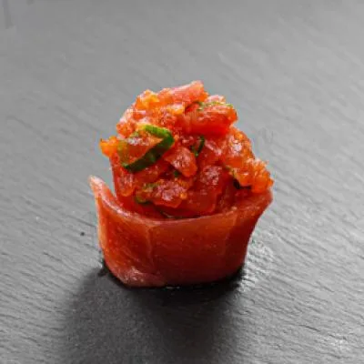8 pièces - tartare saumon, frito peau de saumon et sauce teriyaki |