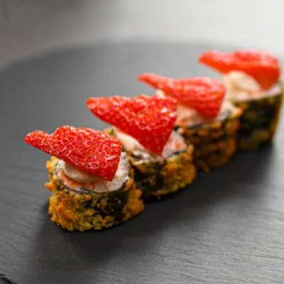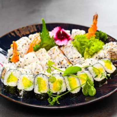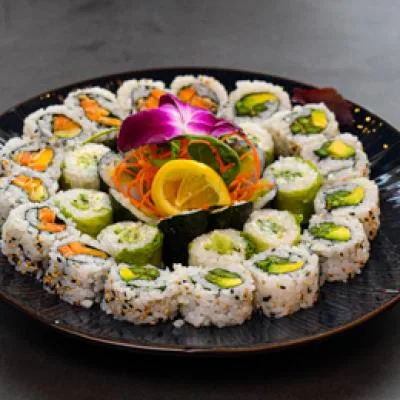avocat, concombre, mangue, wagame, edamame, saumon, thon, bar, anguille, saint-jacques et sauce yaourt | ||