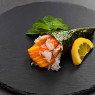 8 pièces - tempura crevettes, concombre, saumon mi-cuit | ||