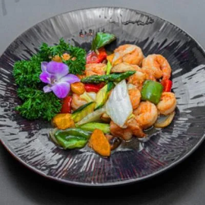 scampis, carottes, courgettes, oignons, oeuf et soja |